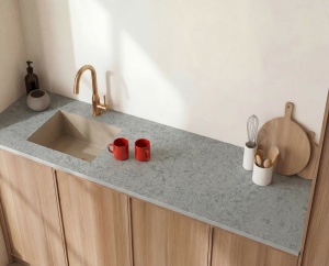 Komposit betyder sammensat og bordplader i komposit består af mere end 90% naturlig kvarts og farvepigmenter, som ved hjælp af harpiks som bindemiddel støbes til en unik plade. Kvarts er et af de stærkeste mineraler efter ædelsten, hvilket giver styrke i overfladen og hårdføre egenskaber til dit køkken.
