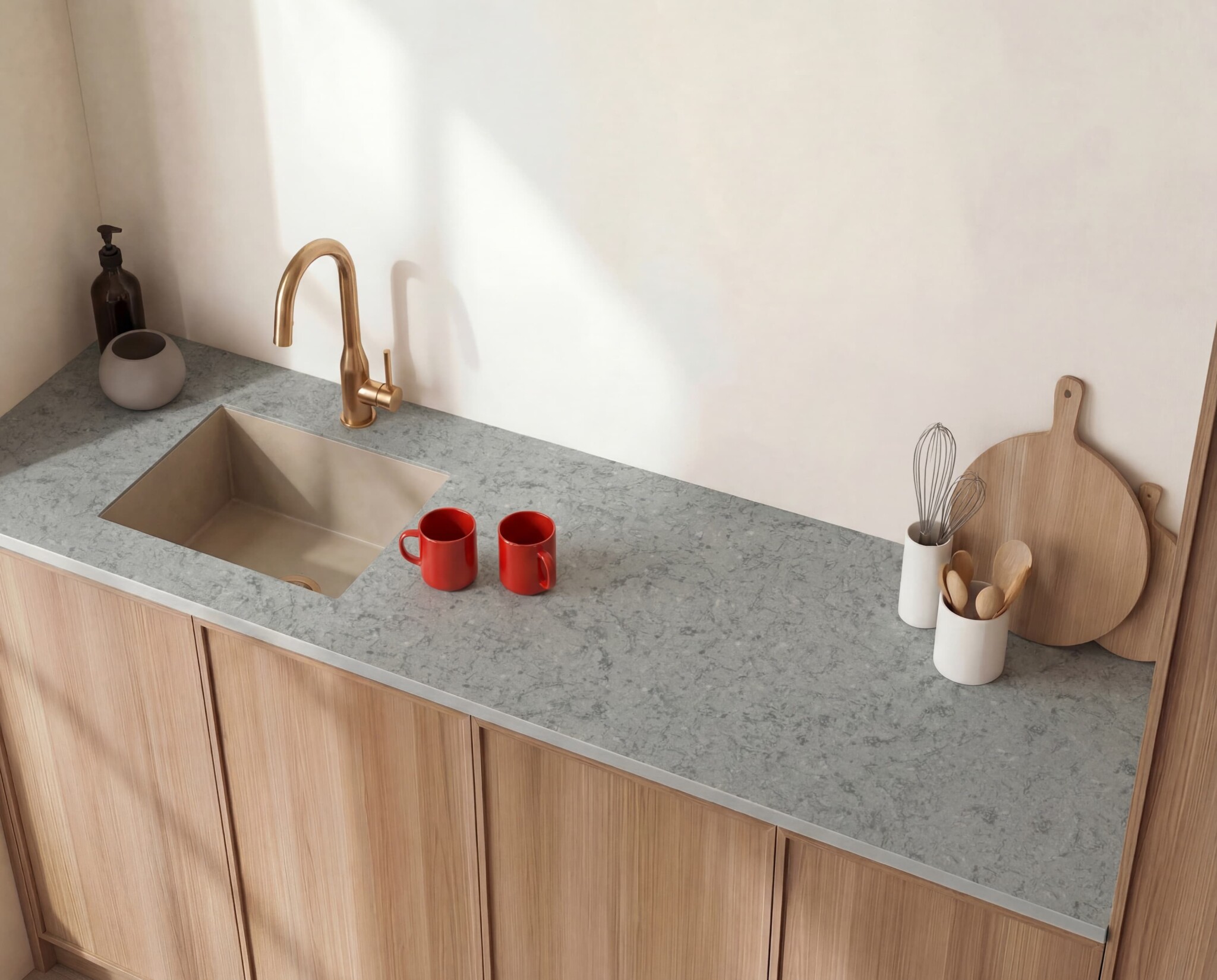 Highly colored foods can discolor light surfaces and should be removed immediately. Quartz withstands most cleaning products, but for thorough cleaning, Q-Action is recommended, since it is a soap with caring components that protects all stone materials and emphasize their natural shine.